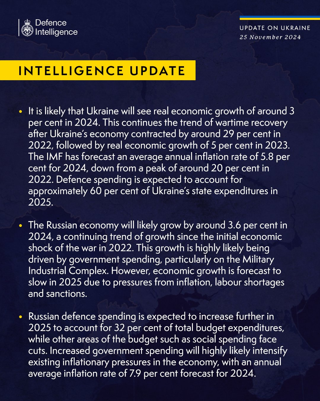 - 우크라이나는 2024년에 약 3%의 실질 경제성장률을 기록할 가능성이 높다. 이는 2022년 우크라이나 경제가 약 29% 위축된 뒤 2023년에 5%의 실질 경제성장률을 기록한 이후 전시 회복세(wartime recovery)를 이어가는 것입니다. IMF는 2024년 연평균 인플레이션율은 5.8%로 2022년 최고치인 약 20%에서 낮아질 것으로 예상된다. 국방비는 대략 2025년 우크라이나 국가 지출의 60%로 예상된다.
