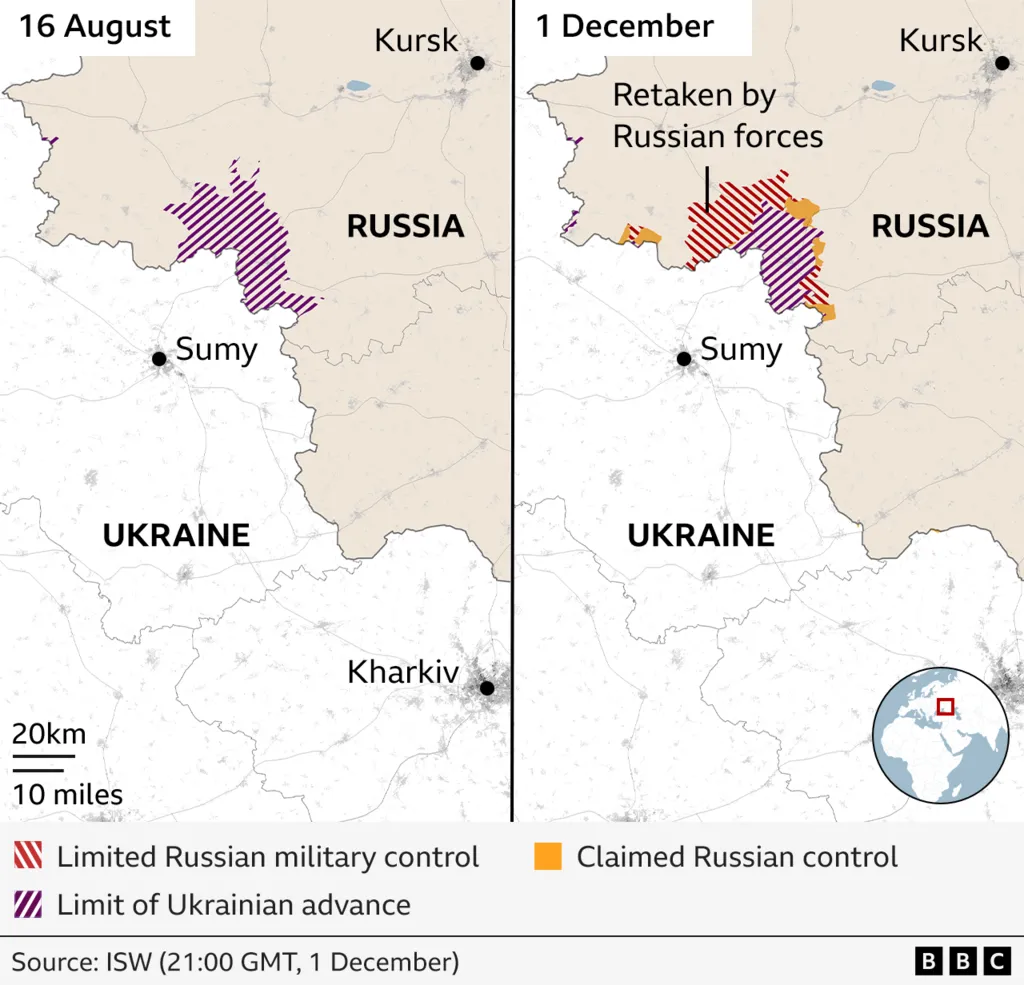 우크라이나가 전격적으로 침공한 쿠르스크 지역에 대해 러시아군이 대대적인 반격을 가하며 40%의 영토가 수복되었으며, 이 곳의 우크라이나 군은 적의 반격과 다가오는 겨울에 어려움을 겪고 있다고 함. (원문 링크)