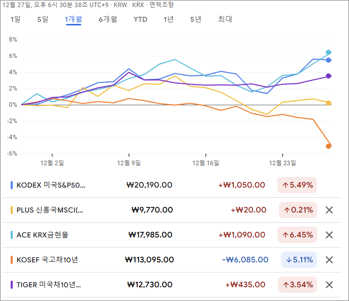 구글 파이낸스(www.google.com/finance)에서 가져온 지난 한 달간의 각 자산의 등락률 그래프입니다.