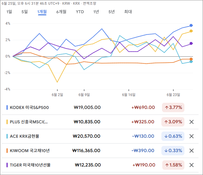구글 파이낸스(www.google.com/finance)에서 가져온 지난 한 달간의 각 자산의 등락률 그래프입니다.