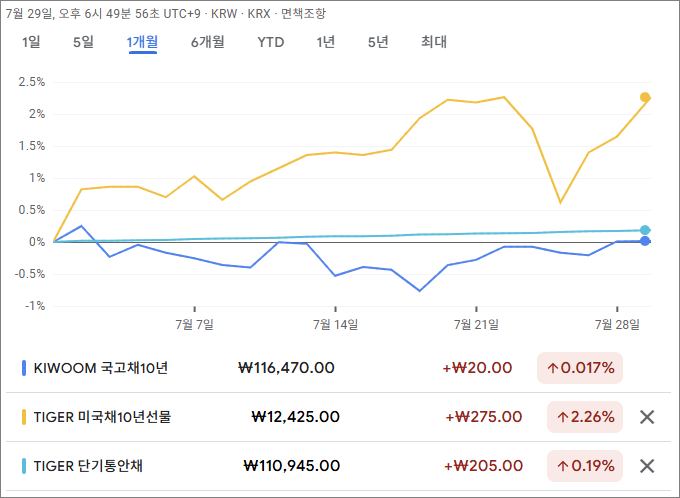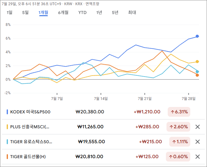 구글 파이낸스(www.google.com/finance)에서 가져온 지난 한 달간의 각 자산의 등락률 그래프입니다.